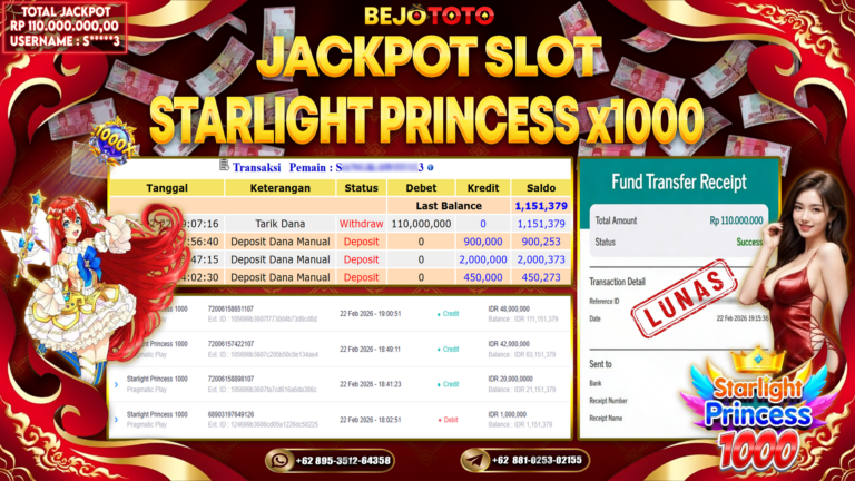 BEJOTOTO – Selamat kepada User id : S*****3 Telah berhasil mendapatkan kemenangan besar pada permainan SLOT PRAGMATIC PRAGMATIC STARLIGHT PRINCESS 1000 Dengan kemenangan Sebesar Rp.110,000,000,-. Setelah mengisi formulir withdraw dengan kurung waktu hanya 5 – 10 menit pihak BEJOTOTO sudah melakukan transfer kepada pemilik Userid dan dana sudah dapat di cairkan oleh pemenang. Bukti pembayaran yang kami berikan merupakan bukti pembayaran yang SAH…
