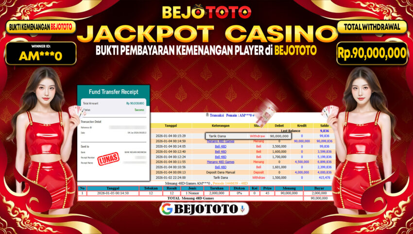 BEJOTOTO – Selamat kepada User id : AM***0 Telah berhasil mendapatkan kemenangan besar pada permainan LIVE CASINO 48D GAMES Dengan kemenangan Sebesar Rp.90,000,000,-. Setelah mengisi formulir withdraw dengan kurung waktu hanya 5 – 10 menit pihak BEJOTOTO sudah melakukan transfer kepada pemilik Userid dan dana sudah dapat di cairkan oleh pemenang. Bukti pembayaran yang kami berikan merupakan bukti pembayaran yang SAH / VALID yang langung di dapatkan melaui tanda transfer transaksi dari Bank yang di tuju.