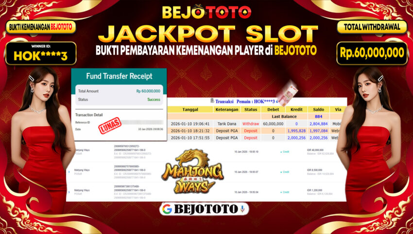 BEJOTOTO – Selamat kepada User id : HOK****3 Telah berhasil mendapatkan kemenangan besar pada permainan  SLOT MAHJONG WAYS  Dengan kemenangan Sebesar Rp.60,000,000-. Setelah mengisi formulir withdraw dengan kurung waktu hanya 5 – 10 menit pihak BEJOTOTO sudah melakukan transfer kepada pemilik Userid dan dana sudah dapat di cairkan oleh pemenang. Bukti pembayaran yang kami berikan merupakan bukti pembayaran yang SAH / VALID yang langung di dapatkan melaui tanda transfer transaksi dari Bank yang di tuju.