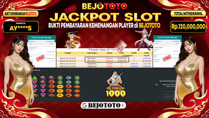 BEJOTOTO – Selamat kepada User id : AY****S Telah berhasil mendapatkan kemenangan besar pada permainan  SLOT PRAGMATIC GATES OF OLYMPUS 1000  Dengan kemenangan Sebesar Rp.120,000,000,-. Setelah mengisi formulir withdraw dengan kurung waktu hanya 5 – 10 menit pihak BEJOTOTO sudah melakukan transfer kepada pemilik Userid dan dana sudah dapat di cairkan oleh pemenang. Bukti pembayaran yang kami berikan merupakan bukti pembayaran yang SAH / VALID yang langung di dapatkan melaui tanda transfer transaksi dari Bank yang di tuju.