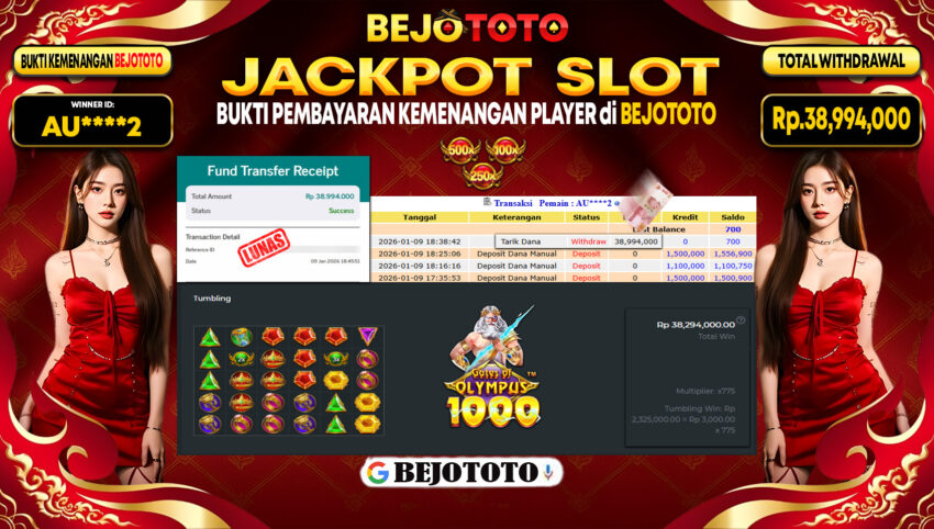 BEJOTOTO – Selamat kepada User id : AU****2 Telah berhasil mendapatkan kemenangan besar pada permainan  SLOT PRAGMATIC GATES OF OLYMPUS 1000  Dengan kemenangan Sebesar Rp.38,994,000,-. Setelah mengisi formulir withdraw dengan kurung waktu hanya 5 – 10 menit pihak BEJOTOTO sudah melakukan transfer kepada pemilik Userid dan dana sudah dapat di cairkan oleh pemenang. Bukti pembayaran yang kami berikan merupakan bukti pembayaran yang SAH / VALID yang langung di dapatkan melaui tanda transfer transaksi dari Bank yang di tuju.