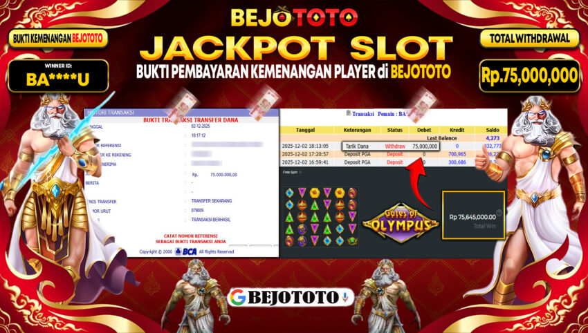 BEJOTOTO – Selamat kepada User id : BA****U Telah berhasil mendapatkan kemenangan besar pada permainan SLOT PRAGMATIC GATES OF OLYMPUS Dengan kemenangan Sebesar Rp.75,000,000,-. Setelah mengisi formulir withdraw dengan kurung waktu hanya 5 – 10 menit pihak BEJOTOTO sudah melakukan transfer kepada pemilik Userid dan dana sudah dapat di cairkan oleh pemenang. Bukti pembayaran yang kami berikan merupakan bukti pembayaran yang SAH / VALID yang langung di dapatkan melaui tanda transfer transaksi dari Bank yang di tuju.