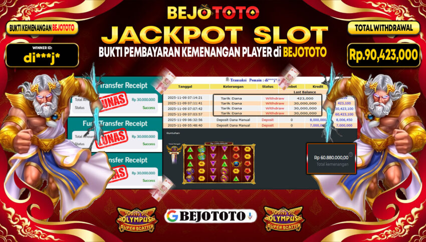 BEJOTOTO – Selamat kepada User id : di***j* Telah berhasil mendapatkan kemenangan besar pada permainan SLOT PRAGMATIC GATES OF OLYMPUS SUPER SCATTER Dengan kemenangan Sebesar Rp.90,423,000,-. Setelah mengisi formulir withdraw dengan kurung waktu hanya 5 – 10 menit pihak BEJOTOTO sudah melakukan transfer kepada pemilik Userid dan dana sudah dapat di cairkan oleh pemenang. Bukti pembayaran yang kami berikan merupakan bukti pembayaran yang SAH / VALID yang langung di dapatkan melaui tanda transfer transaksi dari Bank yang di tuju.