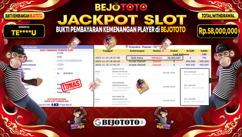 BEJOTOTO– Selamat kepada User id : TE****U Telah berhasil mendapatkan kemenangan besar pada permainan  SLOT WILD APE  Dengan kemenangan Sebesar Rp.58,000,000-. Setelah mengisi formulir withdraw dengan kurung waktu hanya 5 – 10 menit pihak BEJOTOTO sudah melakukan transfer kepada pemilik Userid dan dana sudah dapat di cairkan oleh pemenang. Bukti pembayaran yang kami berikan merupakan bukti pembayaran yang SAH / VALID yang langung di dapatkan melaui tanda transfer transaksi dari Bank yang di tuju.